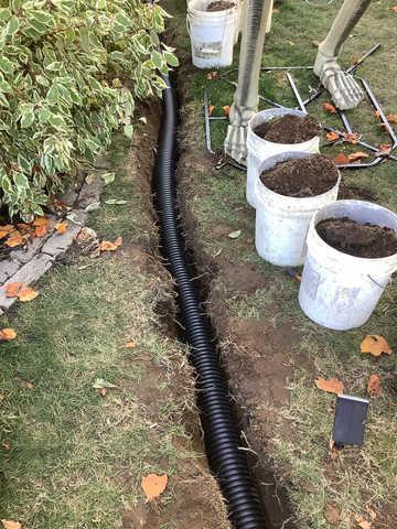 In order to waterproof the basement on the west side of the of the home, We installed a WaterGuard system. We broke out the designated area, a total of 39 feet (26 feet along the west wall, 6 feet along the north wall, and 6 feet along the south wall). From there, removed all concrete debris, cleaned the trench, installed filter cloth, drilled weep holes in the block, and installed the WaterGuard System. Lastly, we re-mortared the floor back. We also added a couple of clean out ports for maintenance in the future if needed. The WaterGuard system drains into the existing sump pump system next to the dryer. From there, we added an IceGuard for protection on the discharge line. We then then buried the discharge line in a 4 inch solid tile going out towards the front of the home approximately 46 feet. The discharge line will terminates into a drywell. In addition, we tied in the downspout on the back corner to help move water away from the foundation.